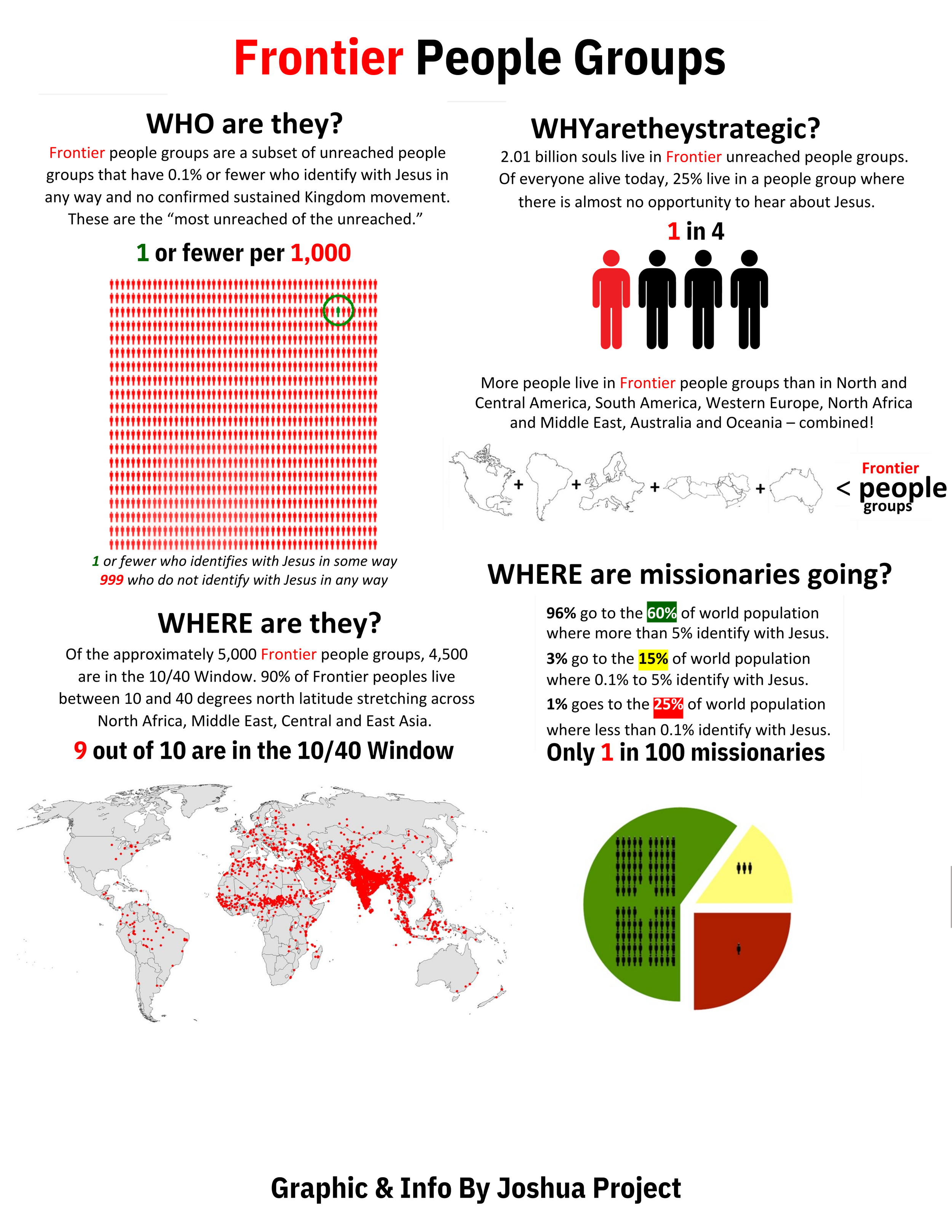 Now, let’s stake it a step further. Frontier People Group are whole societies with virtually no followers of Jesus, no known movements to Jesus, who still needing pioneer cross-cultural workers.